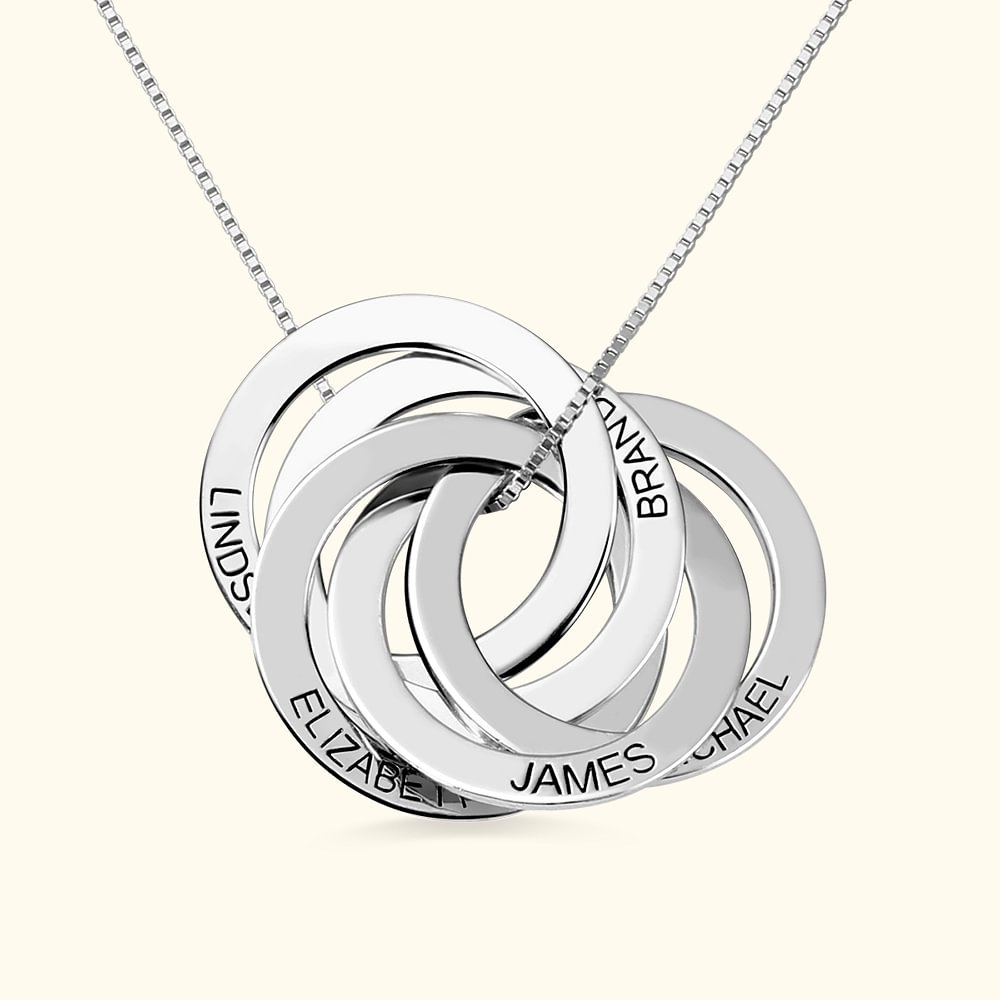 [DISEÑO ENTRELAZADO: La pieza central de este collar es el colgante de anillos rusos entrelazados, que simboliza los inquebrantables lazos del amor, la familia y la amistad. Cada anillo representa a un individuo único, y cuando se combinan, crean un conjunto bello y armonioso. El diseño entrelazado significa la interconexión y la unidad de los que están grabados en el colgante.