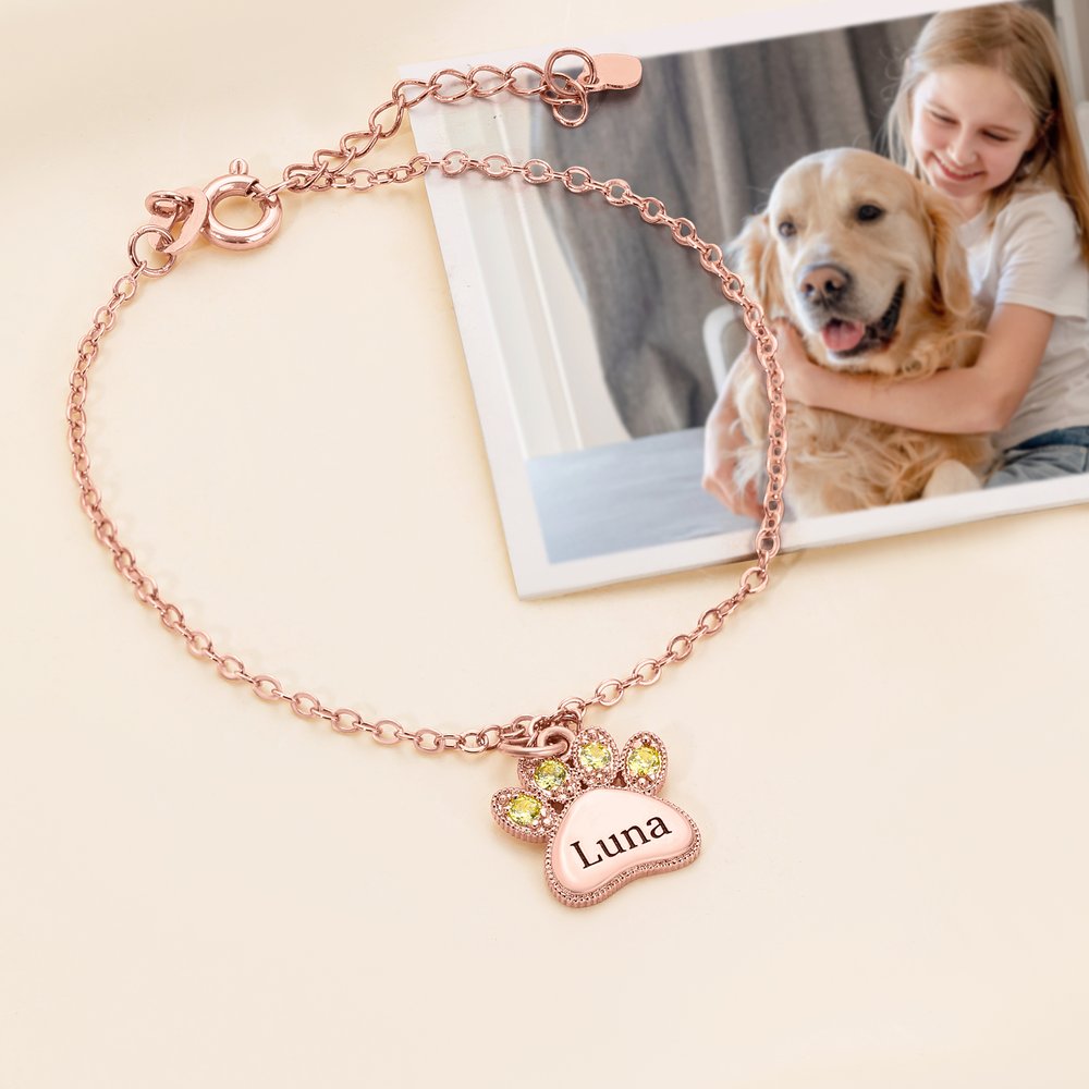 Esta pulsera muestra un distintivo diseño de pata de mascota que puede personalizarse con el nombre de tu mascota, capturando su juguetón encanto. También puedes añadir su piedra de nacimiento para conmemorar su cumpleaños, haciendo que cada pieza sea realmente única. Más que un accesorio, encarna el vínculo especial que compartes con tu amigo peludo, convirtiéndolo en un recuerdo tan único como él.