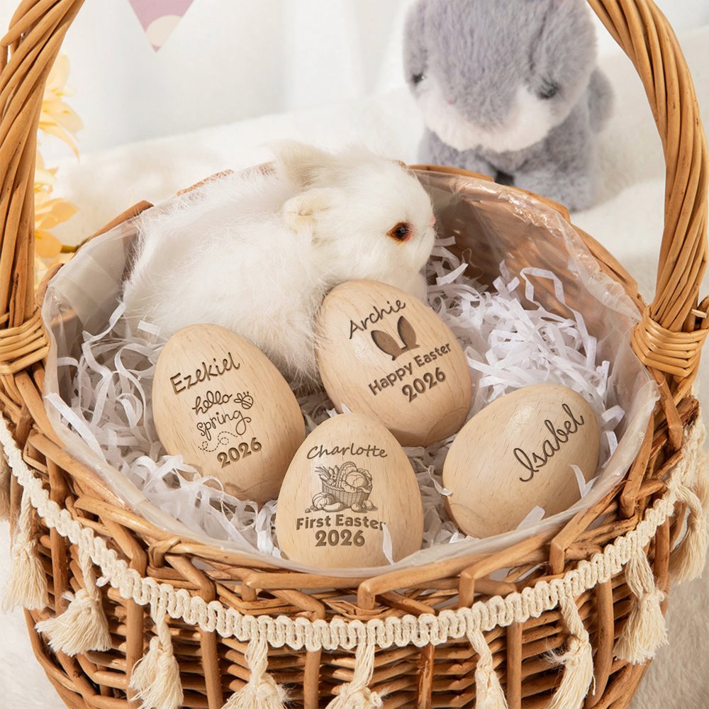 Estos huevos de Pascua de madera presentan una dulce silueta en forma de huevo y encantadores grabados con temática de Pascua. Elige entre varios diseños y personalízalos con un nombre, un texto y el año para crear un recuerdo único. Rellenos de arena, al agitarlos emiten un suave sonido que sirve tanto de adorno como de divertido sonajero musical.
