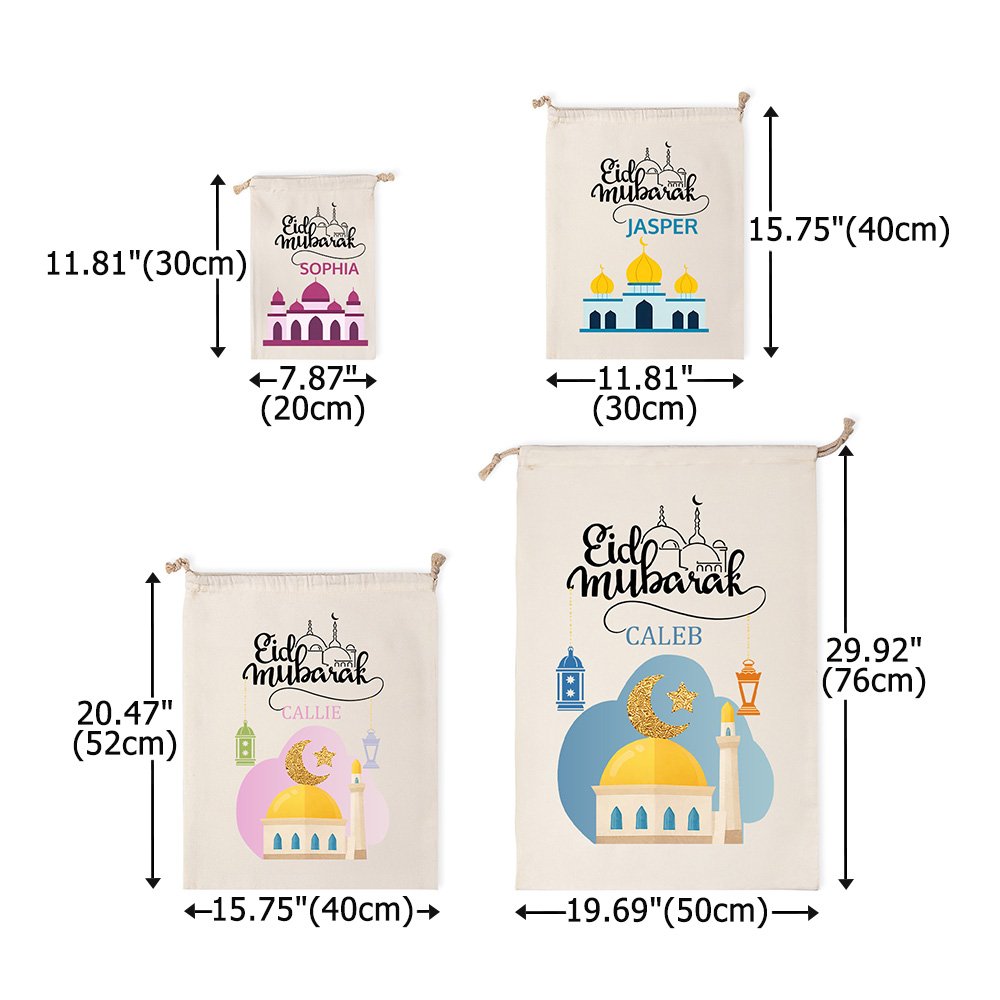 Esta bolsa de regalo está diseñada con el Eid al-Fitr como tema central, y presenta el festivo saludo "Eid Mubarak" junto con alegres motivos de mezquitas, estrellas y lunas crecientes. Los colores vivos y alegres se adaptan perfectamente a la estética infantil. También admite la personalización con el nombre del niño, integrando profundamente el espíritu festivo con un sentido de pertenencia personal, permitiendo que cada niño tenga su propia bolsa de regalo navideña única.