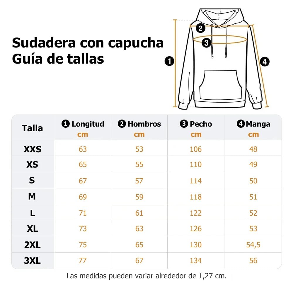 | Medidas: | Camiseta - XXS, XS, S, M, L, XL, 2XL, 3XL, 4XL, 5XL Sudadera y sudadera con capucha - XXS, XS, S, M, L, XL, 2XL, 3XL |