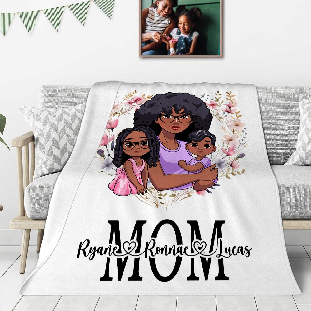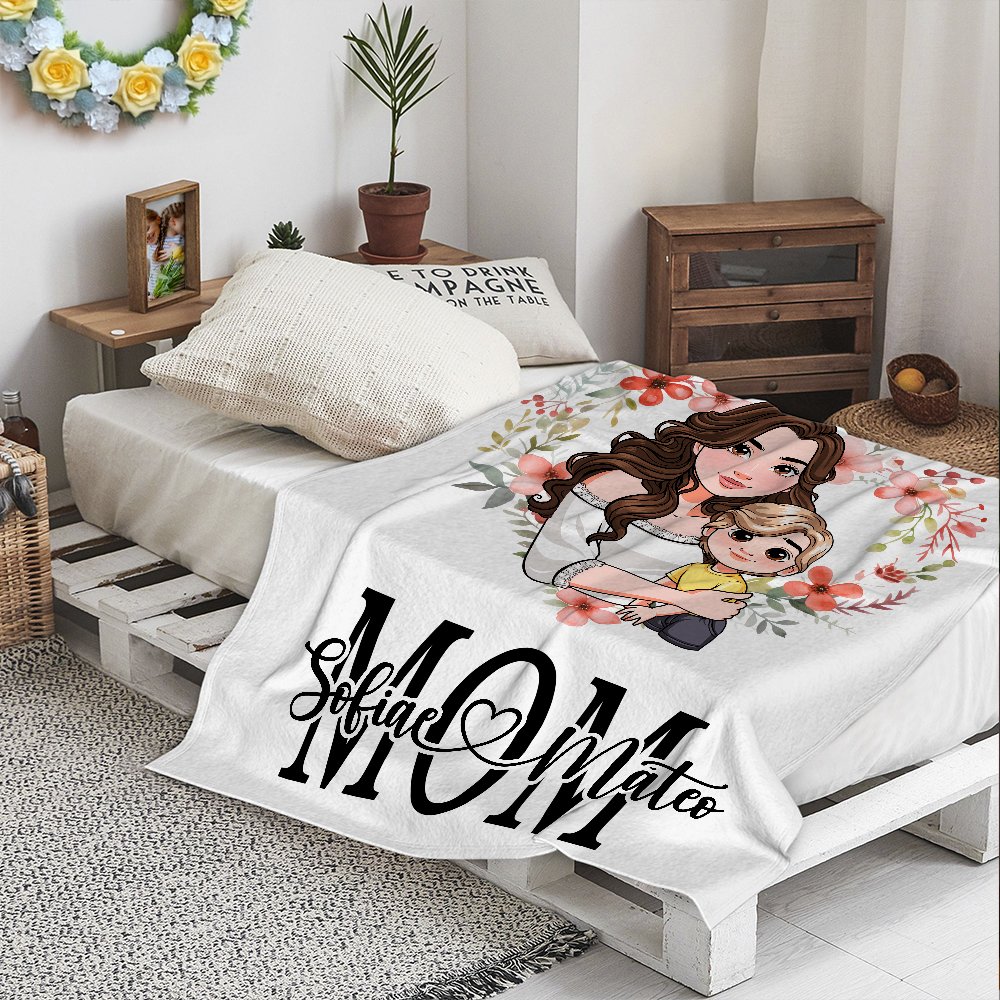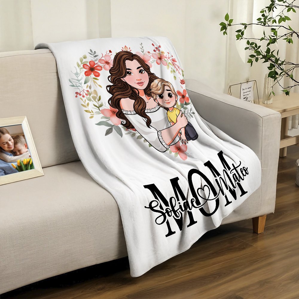 Nuestra manta presenta un diseño con ilustraciones de dibujos animados de una madre y uno o dos hijos, lo que le permite personalizar libremente su estilo y atuendo. Además, ofrecemos un servicio de nombres personalizados. Los nombres que proporcione para la madre y el niño estarán conectados por un símbolo de corazón, complementado por una corona de flores en forma de corazón detrás de los personajes. Este diseño capta a la perfección el profundo vínculo entre una madre y su hijo.