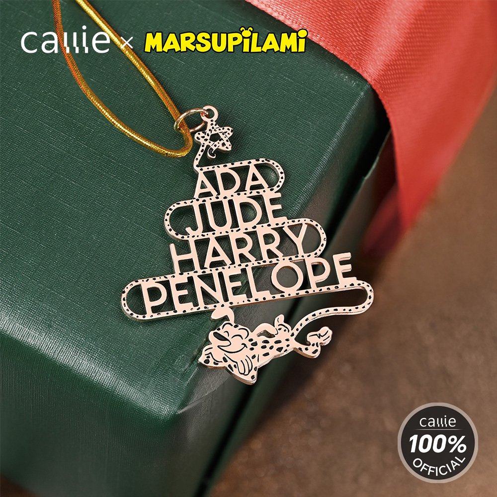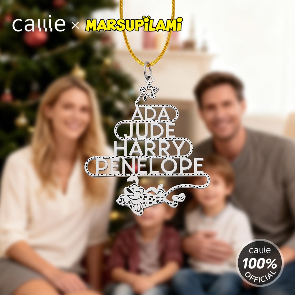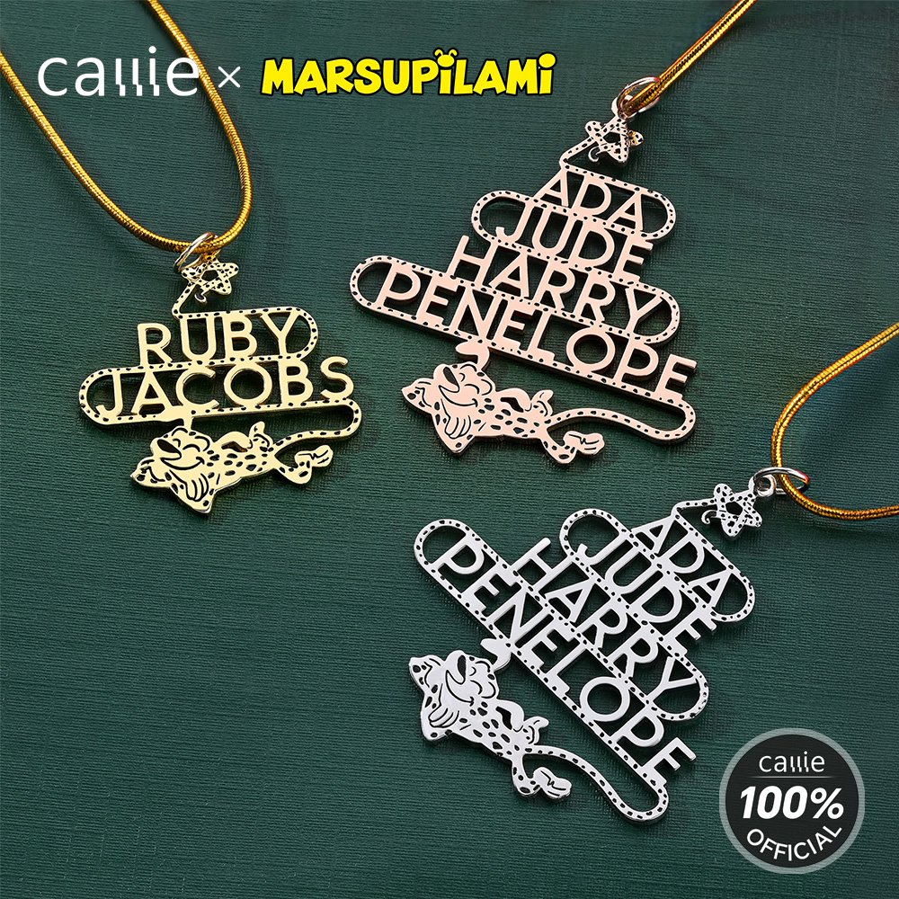 Inspirados en el Marsupilami -una criatura de la selva con pelaje amarillo, manchas negras y una cola extraordinariamente larga y flexible-, estos colgantes presentan líneas fluidas que crean una silueta dinámica. Se puede personalizar con 2-8 nombres para crear un regalo navideño personalizado.