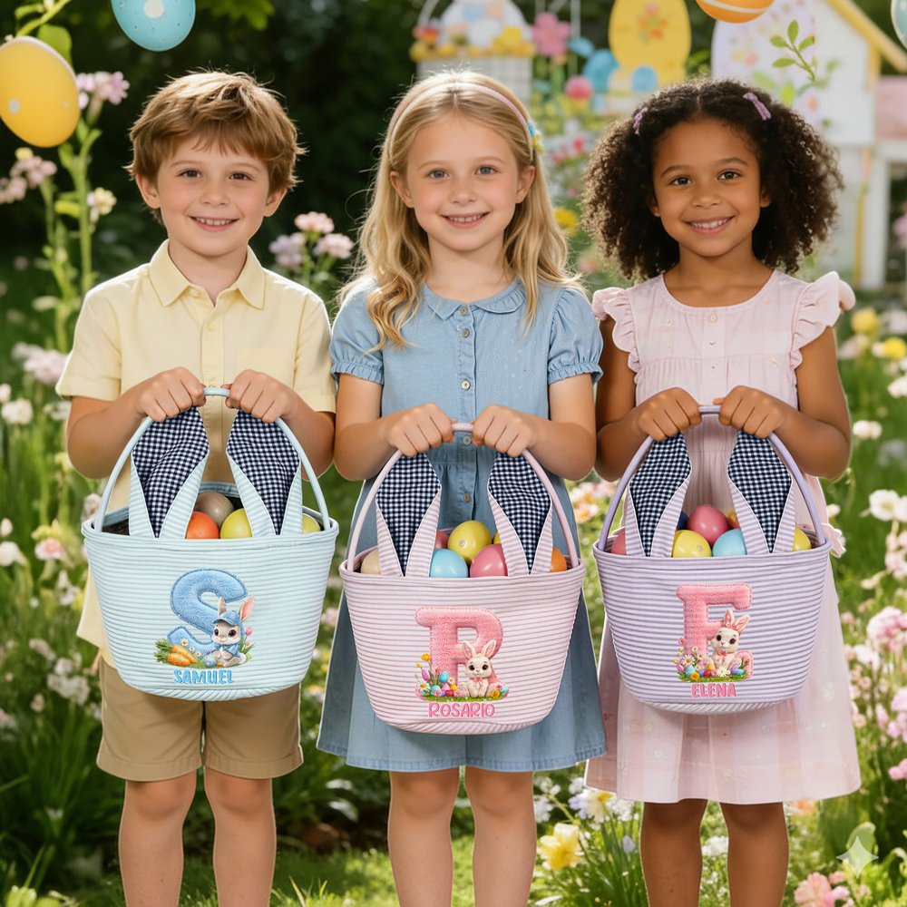 Con un conejo de chenilla tridimensional y un diseño de letras como elemento central del diseño, y personalizable con un nombre personalizado, esta cesta está llena de encanto pascual y diversión infantil. Su diseño suave y adorable encaja perfectamente con la estética infantil.