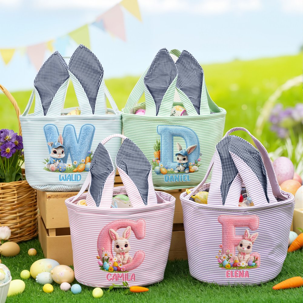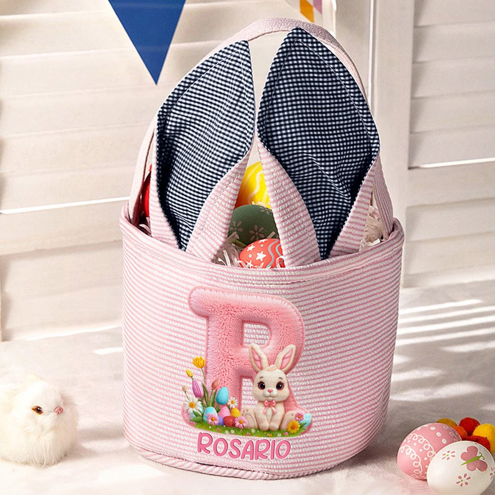 Cesta de pascua personalizada con nombre e inicial efecto 3D simulado orejas de conejo rayas regalo de Pascua búsqueda de huevos para niños